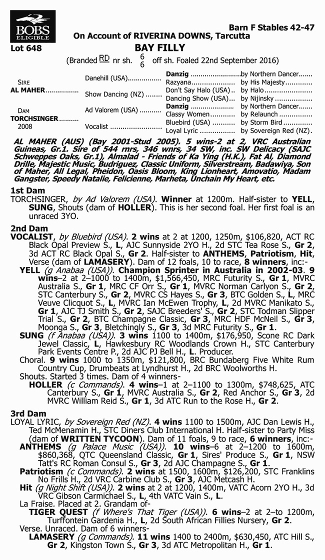 A lovely filly. What you see is what you get. The Dam Torchsinger is a winer and the 2nd Dam Vocalist is a black type winner & producer, including Yell Champion sprinter of Australia 2002-2003 & Sung