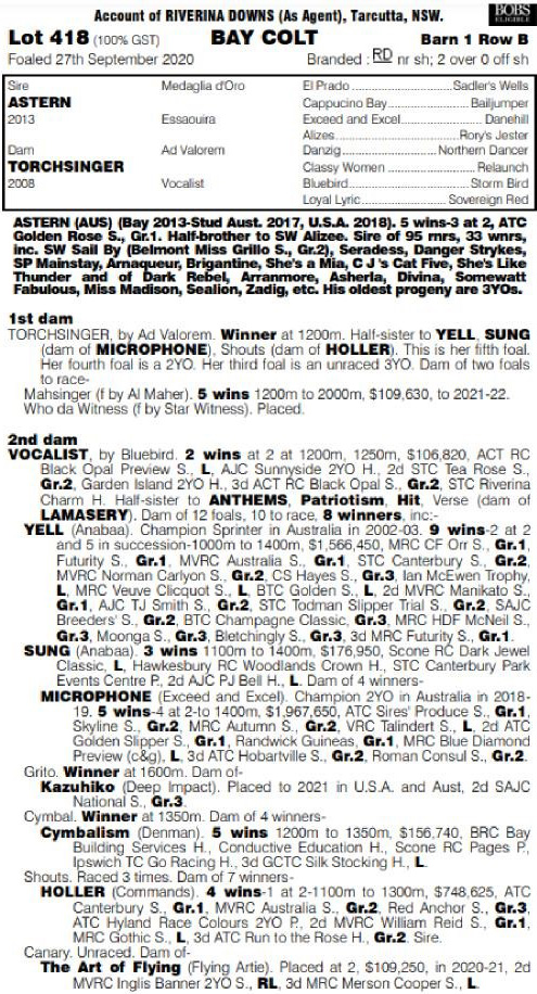 Get involved in this outstanding colt who is out of winning mare 'Torchsinger', a half sister to champion sprinter 'Yell' and winning black type mare 'Sung' (dam of champion 2yo and sire Microphone). To add to his impressive pedigree and looks, this colt is a half brother to 'Mahsinger' who has accumulated 5 wins and over $100,000 in prize money for our stable.