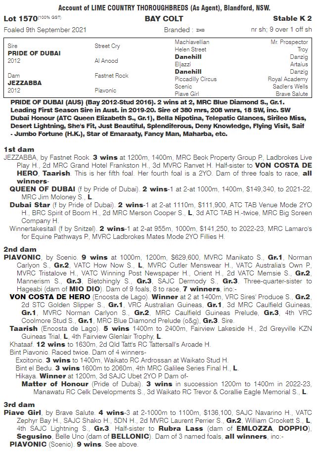 ![]() ![]() By the top sire Pride of Dubai out of the Fastnet Rock City wining mare Jezzabba that has produced 3 to race and all city winners. One stakes winner and the other stakes placed.