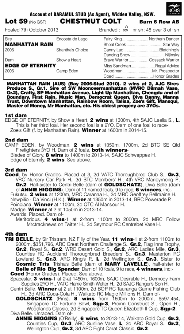 He is a full brother to Zoes Gift trained by David Hayes one win, a second and a third from 4 starts, when she won at Cranbourne. Michael Walker got off and said she was a city class mare. She then started in the mare listed race on Melbourne cup day, she drew wide and went to the front and over-raced. She is now out for a spell. We have got the other full sister to him. She is a 2yo, a nice strong filly with a bright future, and the main reason why we purchased this yearling.