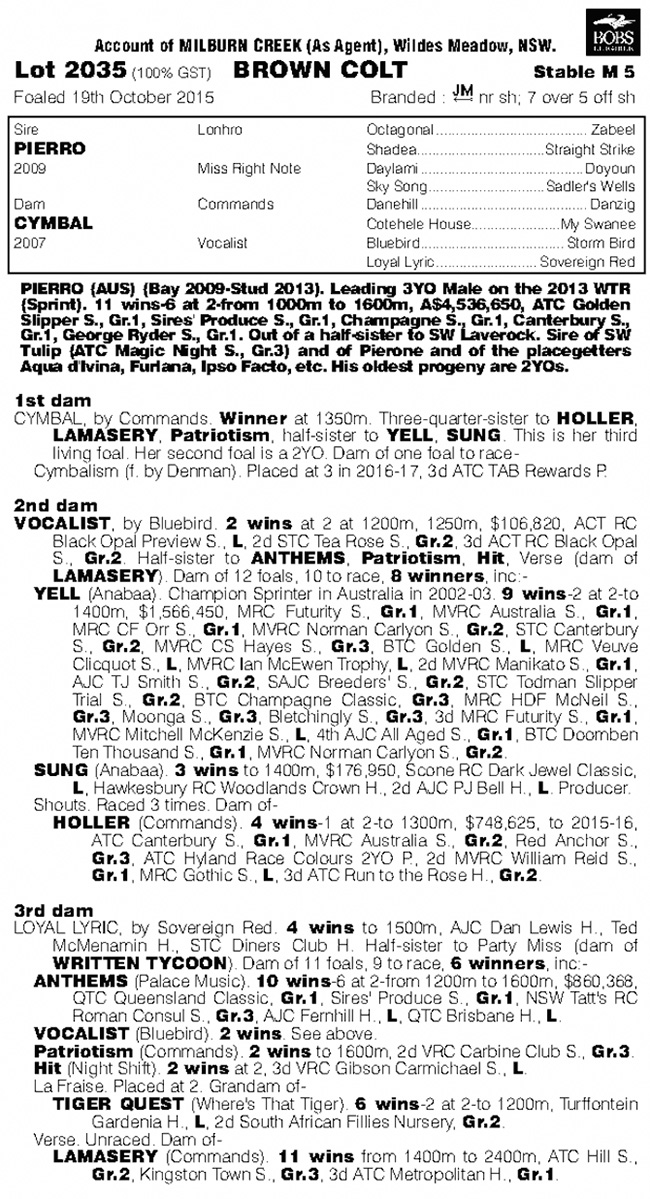 Cymbal is 3/4 sister to Holler, Lamasery and Patriotism ground performers. She has had 1 foal to race Cymbalism trained by Chris Waller. 3 starts 3rd and 4th at Canterbury and a winner at the metro meeting at Scone. He has been broken in. He’s very Athletic and looks as if he’ll go early. The breeding page is full of black type winners.